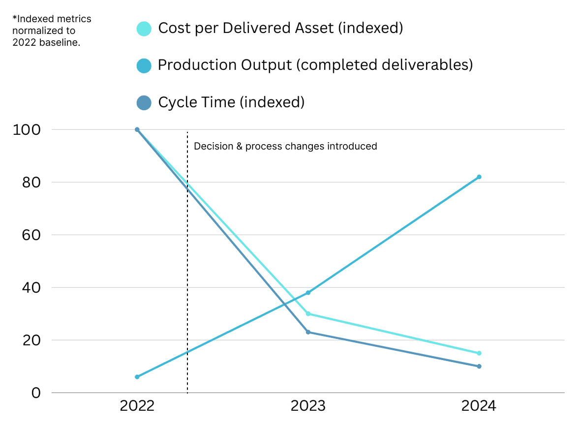 Production output increased while cost per delivered asset and cycle time declined following the introduction of structured intake, prioritization, and self-service enablement.