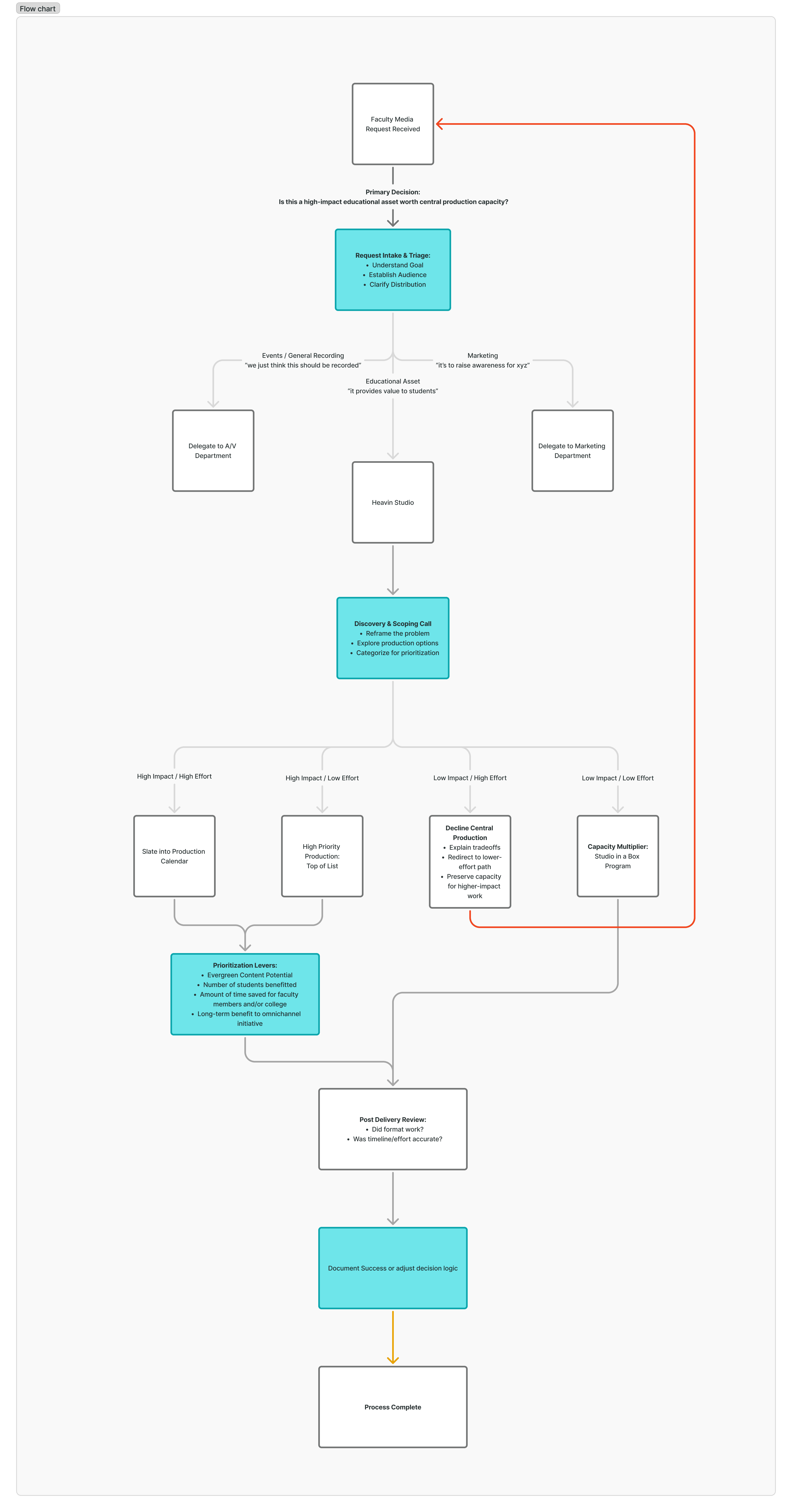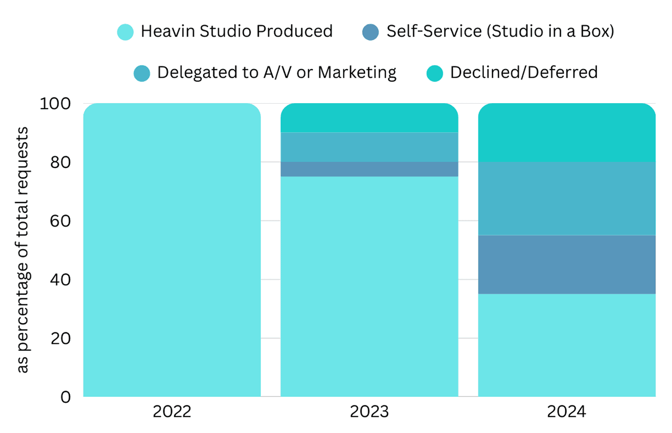 Requests were triaged through structured intake and discovery before being routed to central production, self-service enablement, delegation, or deliberate decline. Post-delivery review informed ongoing prioritization logic.